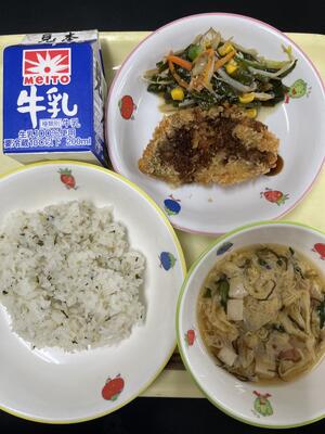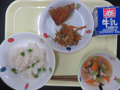 【今日の献立】ピースご飯 カツオの黒酢あん 五目きんぴら のっぺい汁 牛乳