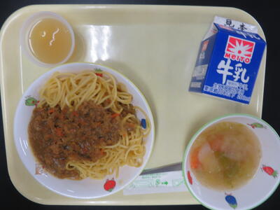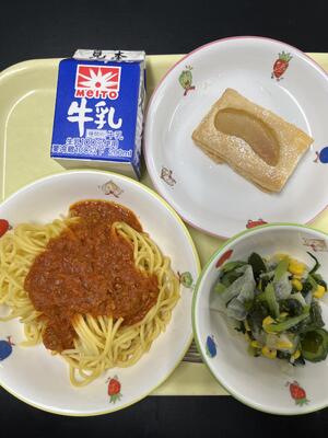【今日の献立】スパゲティ ミートソース コーンサラダ なしのパイ 牛乳