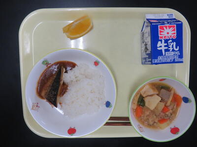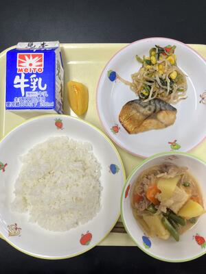 【給食の献立】ごはん さばのさいきょうやき こまつなとコーンあえ にくじゃが かき 牛乳