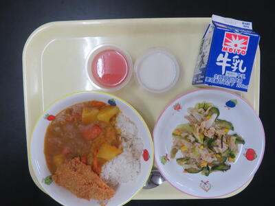 【今日の献立】ごはん ポークカレー ツナとくきわかめのサラダ キャロットゼリー 牛乳