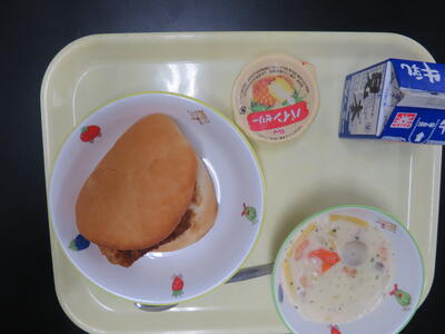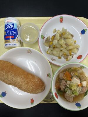 【今日の献立】きなこあげパン にくだんごスープ ジャーマンポテト なしゼリー ジョア