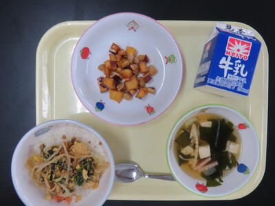 【今日の献立】ごはん ピリカラにくじゃが そくせきづけ だいず・じゃこ・いものあげに 牛乳