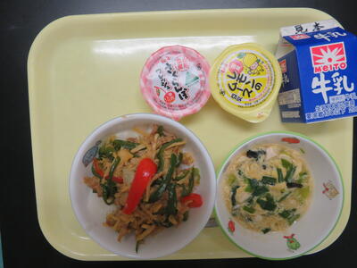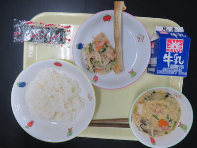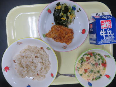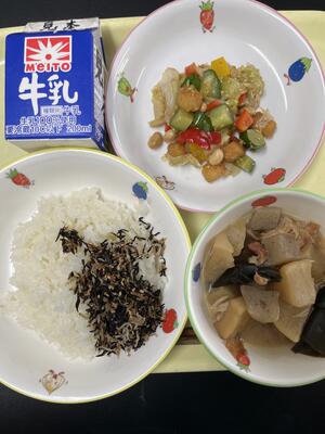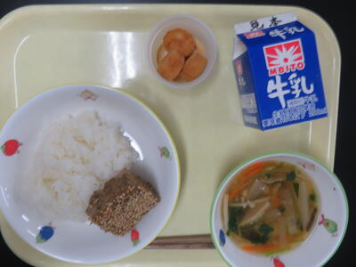 【今日の献立】ごはん だいずとみつばのかきあげ きりぼしだいこんに しらたまスープ 牛乳