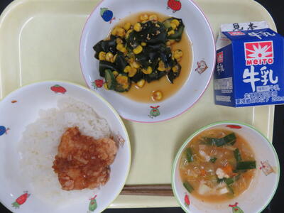 【今日の献立】ごはん 鶏肉のネギソース わかめサラダ 野菜たっぷりみそしる 牛乳