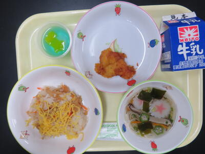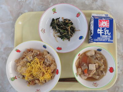 【今日の献立】鳥五目御飯 鮭フライ おかかあえ すまし汁 白玉きなこ 牛乳