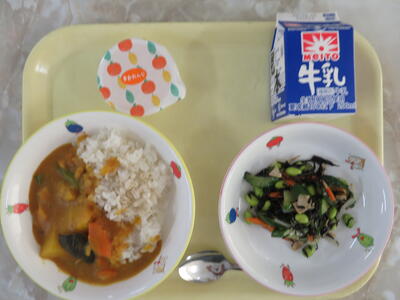 【今日の献立】ご飯 夏野菜カレー ひじきのマリネ フローズンゼリー 牛乳