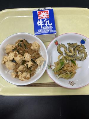 【今日の献立】ごはん マーボーどうふ きりぼしだいこんのちゅうかあえ ゴーヤーチップス 牛乳