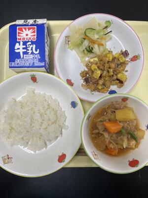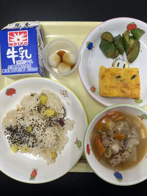 【今日の献立】さつまいもごはん ちぐさやき とさあえ とんじる みたらしだんご 牛乳