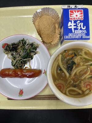 【今日の献立】カレーうどん フランクフルト いそかあえ おはぎ 牛乳