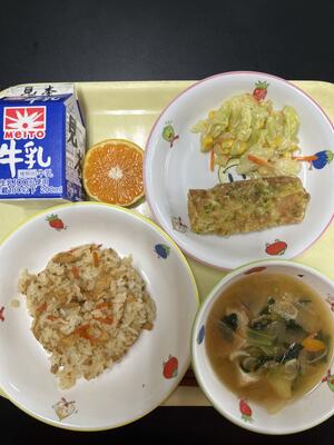【今日の献立】こぎつねごはん ちくわのいそべあげ コールスローサラダ いなかじる はなみかん 牛乳