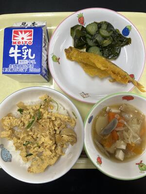 【今日の献立】ごはん あぶたまどん ししゃものカレーあげ きゅうりのすのもの はっぽうみそしる 牛乳