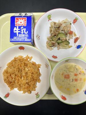 【今日の献立】ジャンバラヤ コーンクラムチャウダー ブロッコリーのごまドレ 牛乳