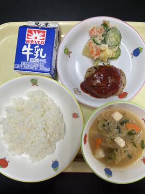 【今日の献立】ごはん れんこんのハンバーグ ポテトサラダ キムチなべじる 牛乳