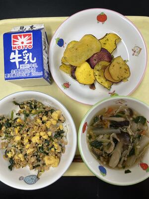 【今日の献立】ごはん さんしょくそぼろ きのこさわにわん さつまチップス 牛乳