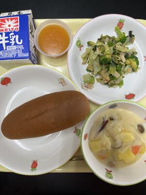 【今日の献立】こくとうパンあきのクリームシチュー ブロッコリーのごまドレ キャロットゼリー 牛乳