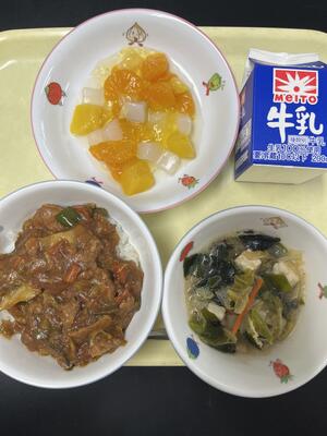 【今日の献立】むぎごはん マーボーどうふ きりぼしだいこんのちゅうかあえ あまなつ 牛乳