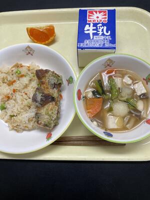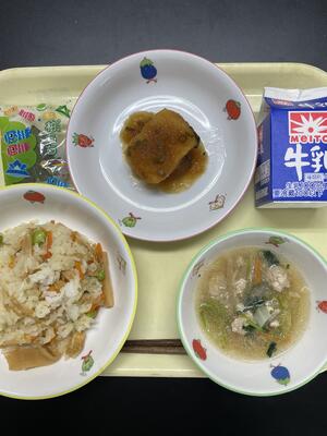 【今日の献立】こぎつねごはん ちくわのいそべあげ だまごじる マンダリン 牛乳