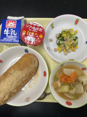 【今日の献立】きなこあげパン ハムコーンサラダ ようふうにこみ ヨーグルト 牛乳