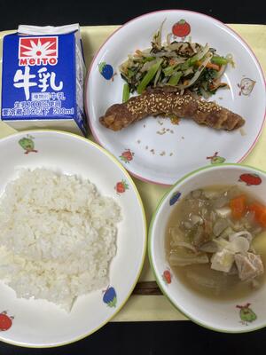 ごはん さめのケチャップソース ちばツナのりすあえ けんちんじる 牛乳