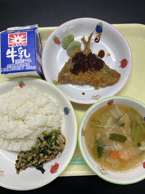 【今日の献立】ごはん アジフライ そらまめ なっとうあえ こんさいみそしる 牛乳