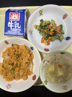 【今日の献立】チキンピラフ カラフルサラダ コーンクラムチャウダー 牛乳