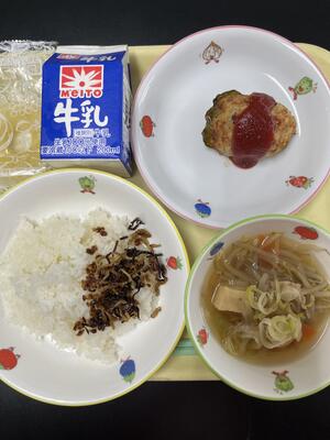 【今日の献立】ピリからごぼうごはん ししゃものパリパリあげ ひじきとツナのマヨあえ わかたけじる 牛乳