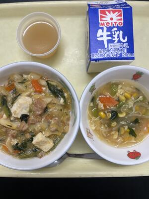 むぎごはん とうふとやさいのあんかけどんのぐ ちゅうかふうコーンスープ ピーチゼリー 牛乳
