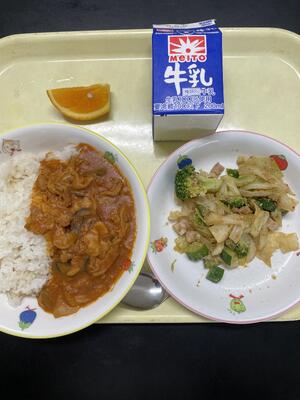 【今日の献立】むぎごはん カツカレー ロースカツ わかめサラダ れいとうみかん ジョア