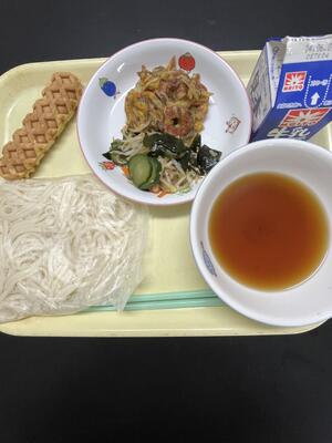 ひやしうどん だいずとやさいのかきあげ しらすいりすのもの はらじゅくドッグ 牛乳