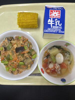 むぎごはん なすいりにくみそどんのぐ うずらたまごとトマトのスープ とうもろこし 牛乳