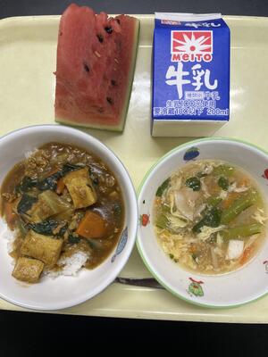 むぎごはん なまあげのわふうカレーどんのぐ かきたまじる すいか 牛乳