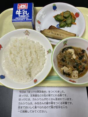 ごはん ほっけのさいきょうやき ごまきゅうり いりどうふ 牛乳