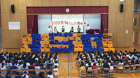 また、5・6年生が運動会で披露したフラッグの表現運動を見せてくれました。旗で作った「150」の文字、運動会では1~4年生には見せてあげられなかったので、見せられてよかったです。