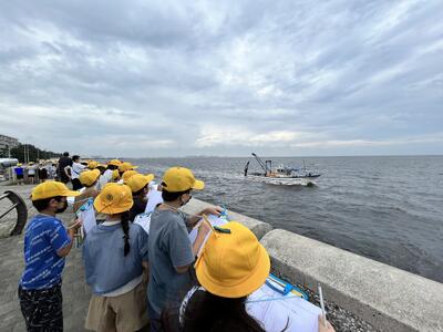 降りた瞬間から潮の匂い。「わー、海の匂いがするー」と口々に言ってました。風が強ったですが、港の様子を見学出来ました。