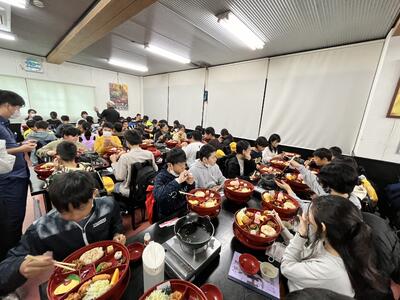ワクワクグループごとに集まり、みんなで給食を食べました。4年ぶりの友だち給食です。