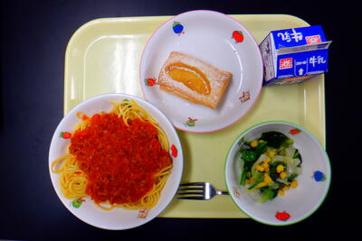 【今日の献立】ミートソーススパゲティ コーンサラダ アップルパイ 牛乳