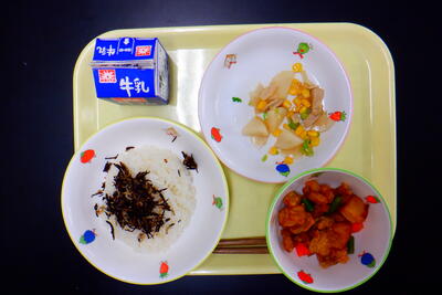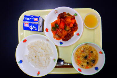 【今日の献立】ごはん すぶた ちゅうかふうコーンスープ パインゼリー 牛乳