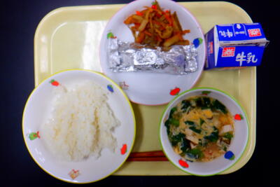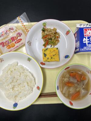 【今日の献立】ごはん ちぐさやき おひたし とんじる クレープ 牛乳