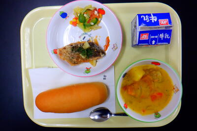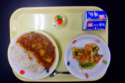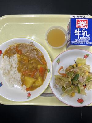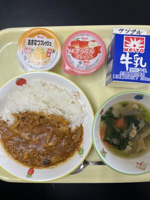 【今日の献立】スパイシーチーズカレー わふうサラダ りんごゼリー 牛乳