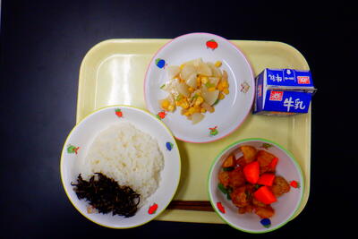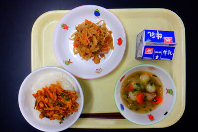 【今日の献立】ごはん ちゅうかオムレツ くらげあえ キムチなべじる 牛乳