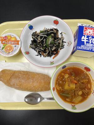【今日の献立】シナモンあげパン ひじきのマリネ ポークビーンズ オレンジゼリー 牛乳