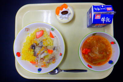 【今日の献立】ターメリックライスクリームソースかけ ミネストローネ クリスマスプリン 牛乳