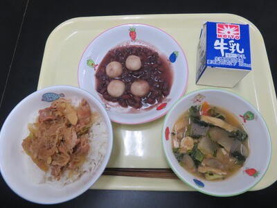【今日の献立】ぶたどん さつまいもじる しらたまあずき 牛乳