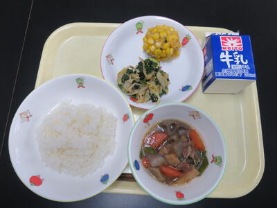【今日の献立】ごはん コーンのかのこむし ごまあえ ちくぜんに 牛乳