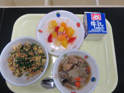 【今日の献立】さんしょくそぼろどん ちゃんこじる フルーツポンチ 牛乳