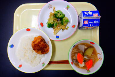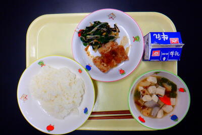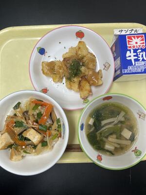 【今日の献立】ごはん ぶたにくのかりんとあげ ちぐさあえ ななくさだまこじる 牛乳