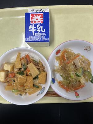 【今日の献立】かじょうどうふどん はるさめサラダ 牛乳