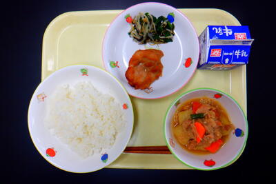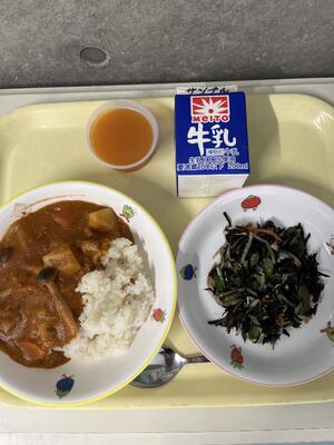 【今日の献立】ごはん あつあげのカレーにこみ やきししゃも いそかあえ 牛乳