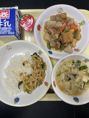 【今日の献立】だいずとみつばのかきあげどん きりぼしだいこんに しらたまスープ 牛乳