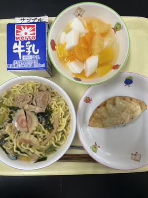 【今日の献立】しょうゆラーメン あげぎょうざ あんにんどうふ 牛乳